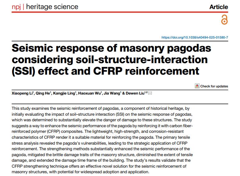 近日,来利国际旗舰厅2022级硕士研究生李小鹏以第一作者身份在中科院一区Top期刊《npj Heritage Science》发表“Seismic response of masonry pagodas considering soil-structure-interaction (SSI) effect and CFRP reinforcement”的高水平论文,该期刊为《自然》合作期刊npj系列,具有较高的学术声誉。