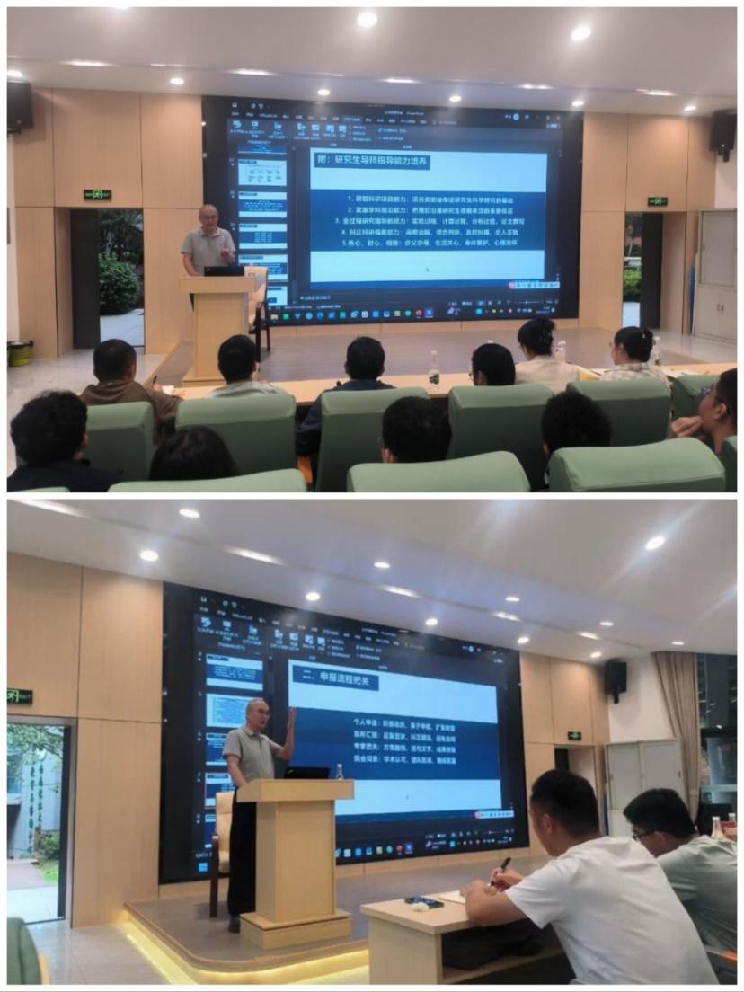 公司银龄教师郭少华教授担任主讲,围绕科研项目申报与研究生指导能力的提升,为在场师生提供了系统而深入的指导。郭教授首先系统梳理了公司科研发展现状,重点分析了在项目数量、研究方向广度及前沿技术融合等方面存在的提升空间。他强调,应在保持力学学科传统优势的基础上,积极拓展“声光电机理与多场景合作”“智能建造”等前沿交叉领域,并加强数据驱动与人工智能等方向的战略布局。
