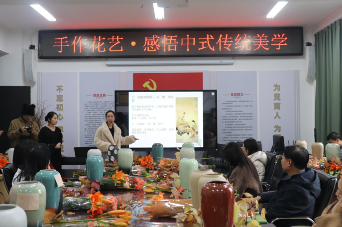 活动伊始,特邀资深花艺师陈艳梅为大家带来了一场精彩的中式花艺讲座。花艺师详细分享了中式花艺的历史渊源、风格特点以及寓意解读,带领大家走进了花艺的奇妙世界。在讲座中,大家不仅了解到了花艺的基本知识,更被中式花艺所蕴含的哲学思想和审美情趣所深深吸引。