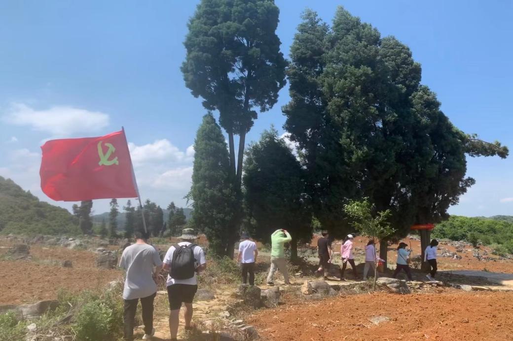 15:00,教工党支部党员沿着原边纵行军路线前行,烈日下,全体党员穿荆棘、越山石,历时约两小时行走4公里山路到达原中共罗盘县地委指挥部旧址。走在重走边纵路的小道上,大家切身体验了当年边纵战士们艰苦的斗争环境,真实感受了红色政权的来之不易。