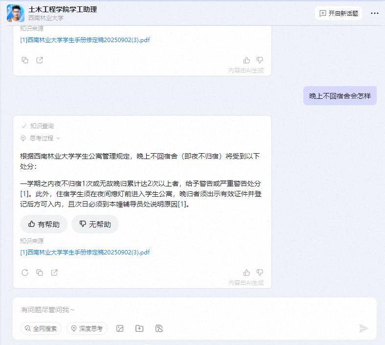 AI助手深度融合了本院的教学与管理特色员工可随时获取公司通知信息还能解答关于课程学分、校规校纪、安全规范等员工管理问题,成为员工们触手可及的“智能学工管家”。